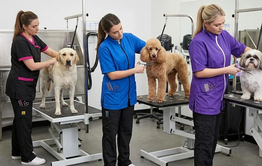 We suggest opting for Tier 1 quick-dry gear during the bathing stage and switching to the Tier 2 crisp-fit professional wear for trimming and styling displays. This ensures your professional image remains sharp and "on point" all day long.